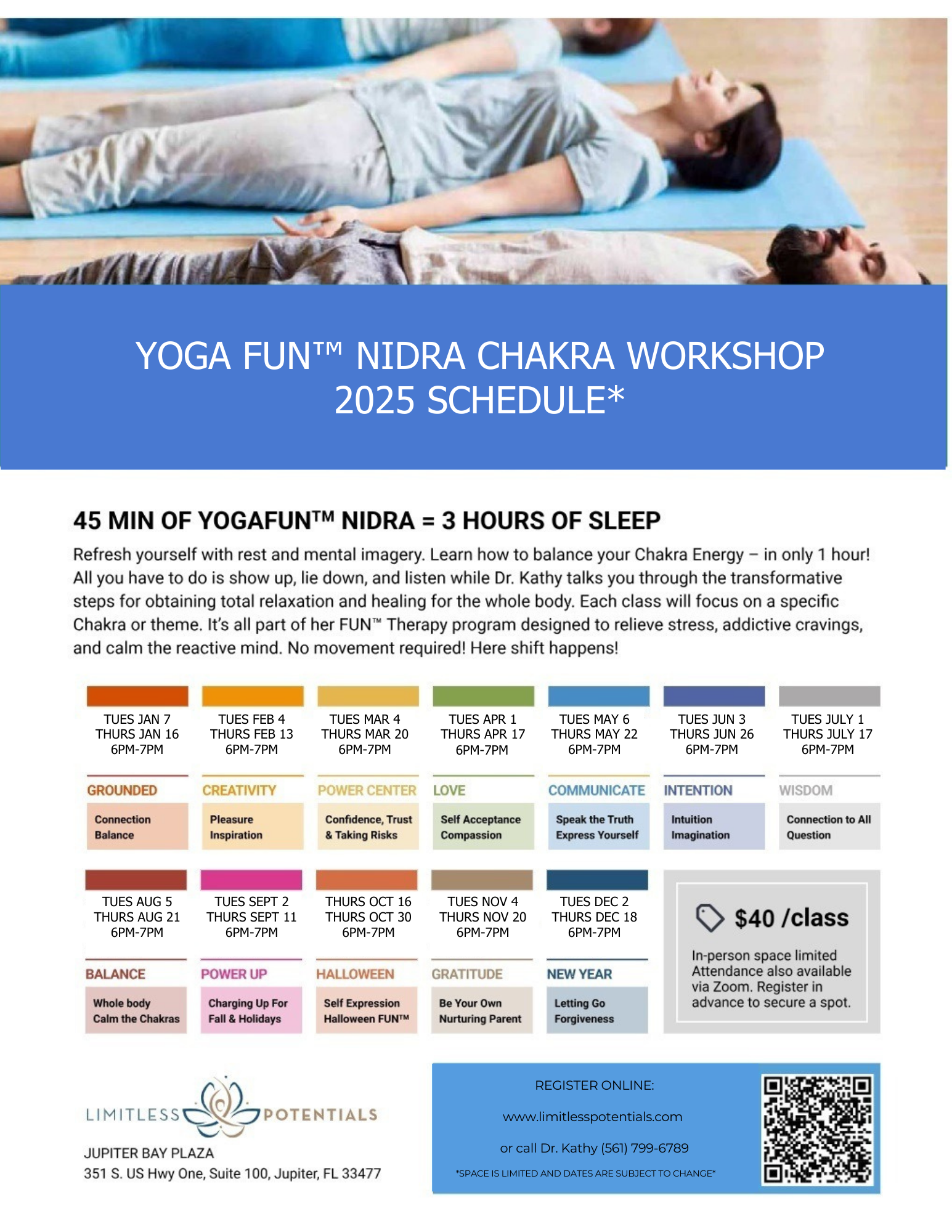 Relax and recline during YogaFun(TM) Nidra! Refresh, reset, and recharge the chakras and your brainbody as Dr. Kathy guides you through a transformative energetic journey of healing for the whole body. All you have to do is show up, lie down, and receive self care-no talking or movement required. During this FUN(TM) hour, the practice of yoga nidra is designed to relieve stress, control addictive cravings, and calm the reactive mind. Here shift happens!